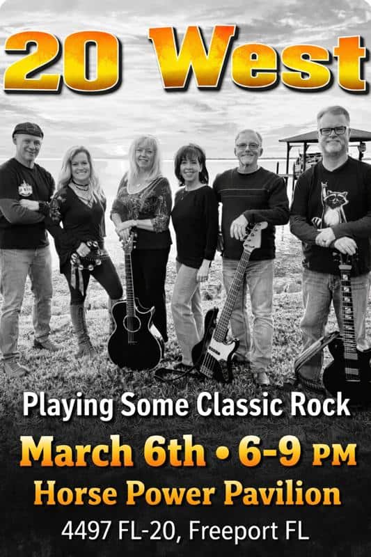 20 West March 6, 2026- Horse Power Pavilion 6pm – 9pm March 6 @ 6:00 pm - 9:00 pm Horse Power Pavilion 4497 State Highway 20 West, Freeport, FL, United States Three hours of classic hits to rock your Friday night!